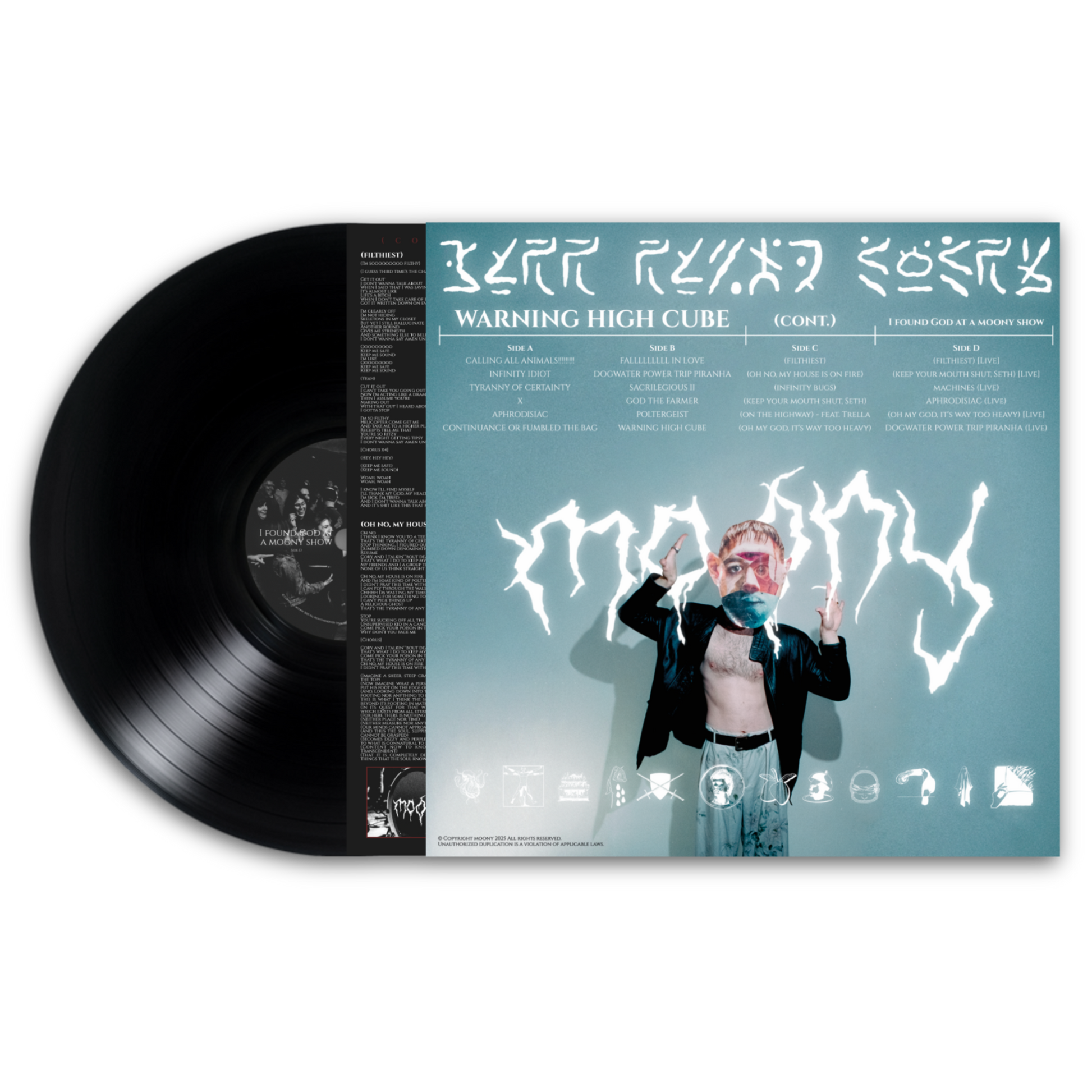 After amassing an impressive collection of genre-spanning EPs scouring depths of emotion, pain, anger, relief, and hope, and carefully crafting a compelling must-see live show, burgeoning Nashville-based indie alt rocker moony (frontman of Honest Men before their disbandment in 2022) is at full form, ready to deliver his debut LP to the world. WARNING HIGH CUBE is a bold full-throttle whirlwind of a hero’s journey, serving as moony’s definitive allegory of his life so far, exploring swirling ideas of existentialism, nature, animals, spirituality, love, friendship, and the threads that hold humanity together. Co-produced alongside Michael Guillot, multi-instrumentalist moony’s distinct writing and production style shines through a sonic landscape of lush and gritty guitars, buzzing synths, intricate drum parts, and melodies that stick with the listener immediately after first listen. A new world ripe for the picking, WARNING HIGH CUBE, it’s accompanying surrealist visual album film co-directed by moony and Joey Brodnax, and the new EP (cont.) which picks up where the album left off are here to save mankind.